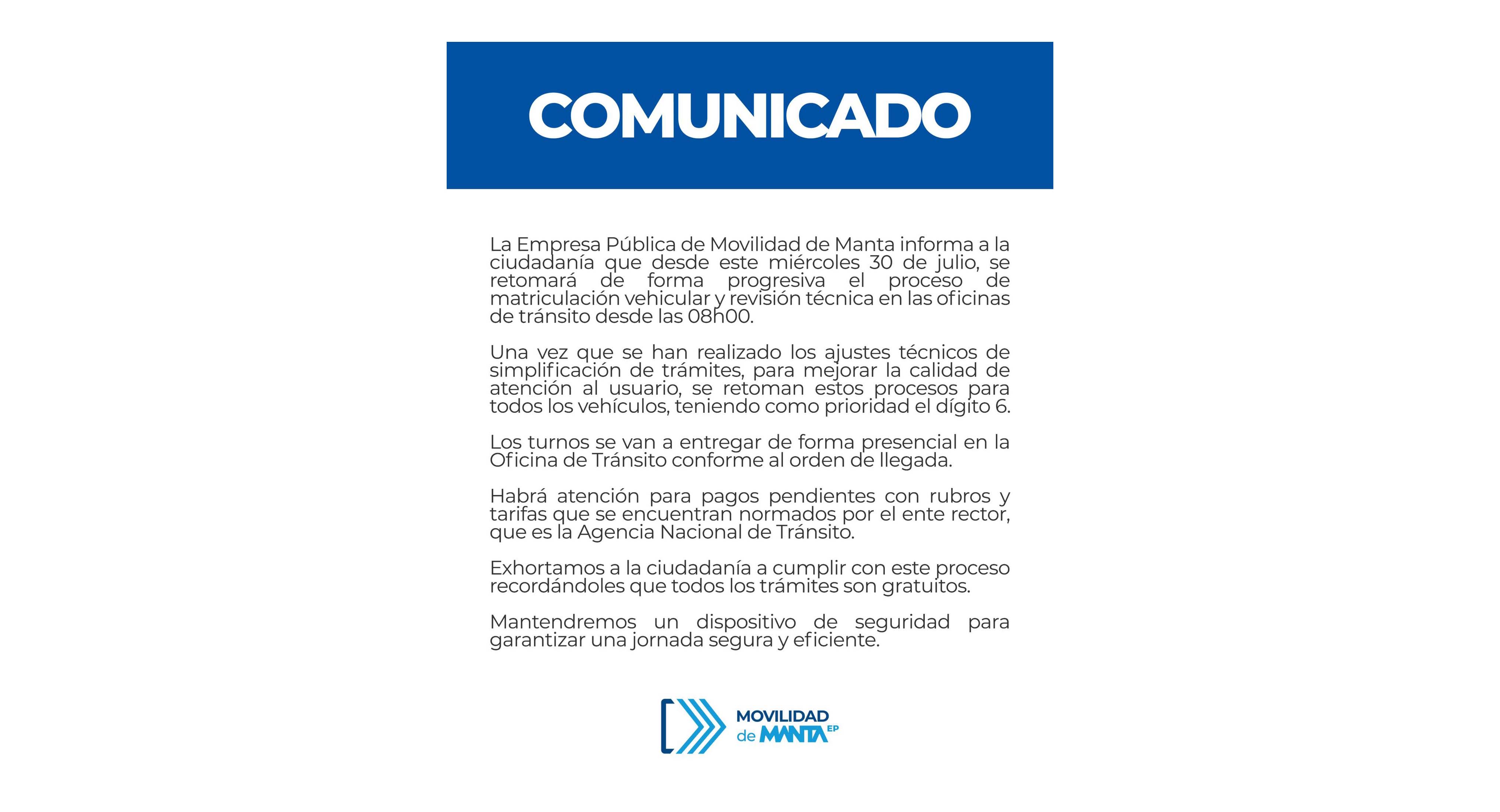 La Empresa Pública Movilidad de Manta, retomó el proceso de matriculación incorporando un tratamiento de simplificación de trámites para darle facilidades a los usuarios.