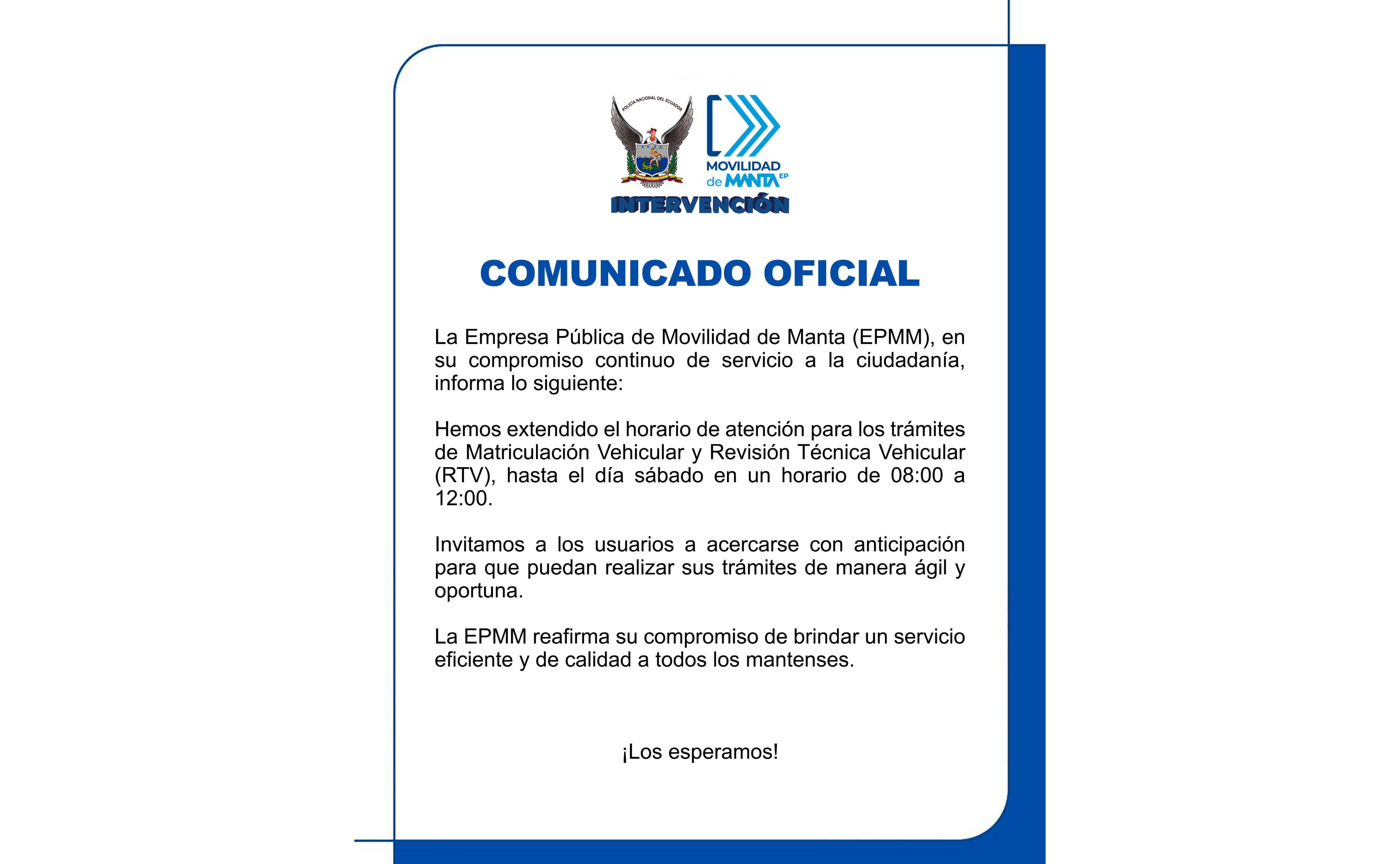 El señor Teniente Coronel, Carlos Albán, delegado de la intervención de la Empresa Movilidad de Manta, informó que el proceso de matriculación será progresivo, esto permitirá medir la gestión diaria para lograr la eficiencia en la matriculación y revisión técnica vehicular.