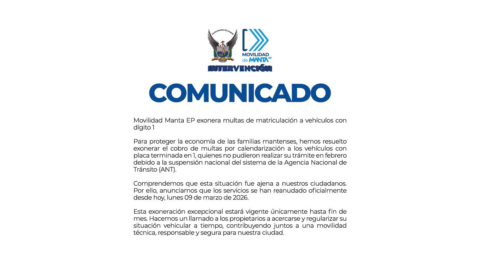La Empresa de Movilidad de Manta, en intervención de la Policía Nacional, trabaja con transparencia y agilidad para ofrecer un servicio seguro y confiable a la ciudadanía.